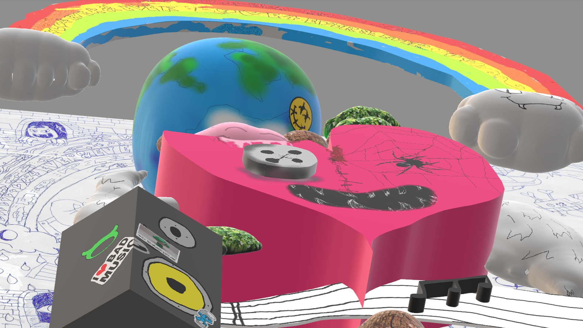 'I started with a ballpoint drawing on a big piece of paper. I digitally scanned the drawing and traced various elements by hand in Paint 3D. This is a version of the well-known Microsoft Paint programme that got introduced with Windows 10. It offers users an accessible way to create, edit and animate 3D-models without advanced technical knowledge. In Paint 3D, drawings can easily be provided with colours, textures and lighting, resulting in a vibrant 3D world. The final video being shown in Amare is a screen recording in which I show the 3D drawing from different perspectives and zoom in on details.'