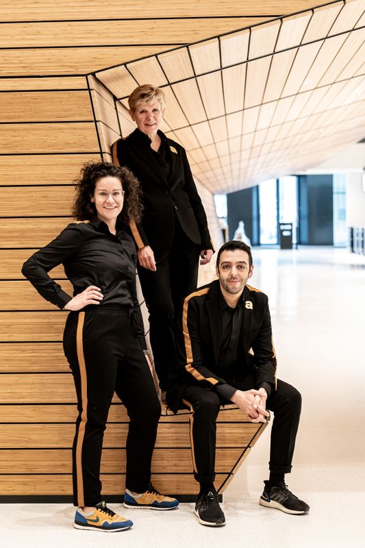 Voor de andere kleuren vond Barnaart overal inspiratie. “De kleding bij het popprogramma wilde ik heel duidelijk in het zwart, een beetje stoer. Daar heb ik een camel-goudkleur bij gebruikt. De kleding in de Amare Brasserie is smaragdgroen, lichtjes geïnspireerd op art nouveau en de oude metropoorten in Parijs. Ik dacht dat de kleur mooi zou staan bij de planten aan het plafond. Toen wist ik nog niet eens dat de Brasserie zou gaan werken met een plant-based concept, dus het blijkt ook inhoudelijk te kloppen!”