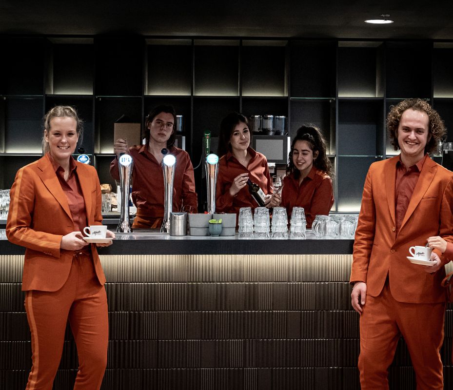 Het team van Amare had voor Barnaart een uitgebreide briefing samengesteld. “Dat heb ik laten bezinken en op een gegeven moment viel dat als een puzzel in elkaar. De kleuren in het stijlboek van Amare vond ik een heel duidelijke statement. Daar ben ik mee verder gegaan. Sommige kleuren heb ik wat bijgestuurd, zodat ze ook geschikt zijn voor kleding. Ook de materiaalanalyse heb ik afgestemd op Amare. De hosts dragen bijvoorbeeld een cognac-koperkleur. Dat zit een beetje tussen het goud en hout van het pand in en geeft aan de voorkant van Amare een warme sfeer.”
