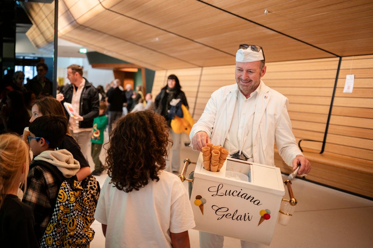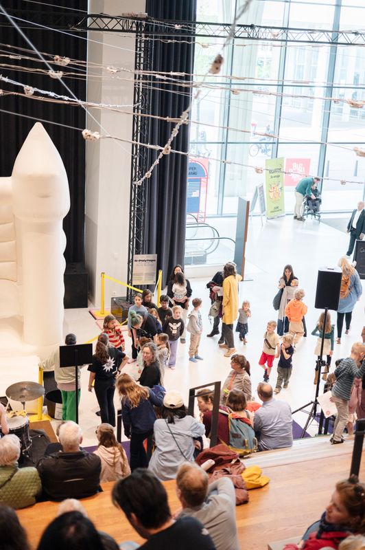 Niet alleen in de zalen was het druk, maar ook in de openbare ruimte was er veel gezelligs te beleven. Er werd volop geknutsed en gedanst in de silent disco op het Kunstenplein, gesprongen in het Hoppeslot springkasteel en gesmuld van de ijsjes van zingende ijscoman Luciano Gelati. Overal in het gebouw kwamen verschillende muziekkunstenaars de bezoekers verrassen.